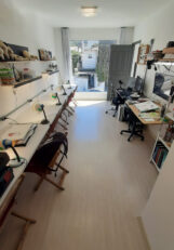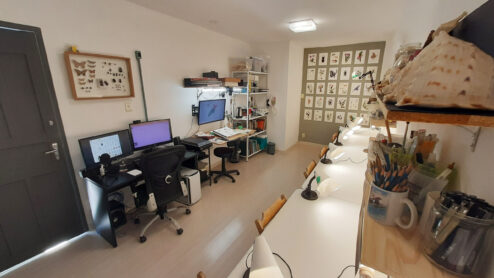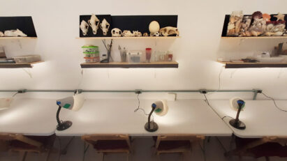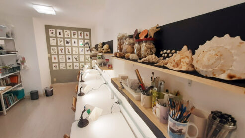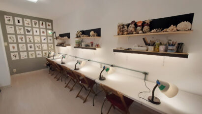 O estúdio é um espaço que aguça a criatividade. Materiais e instrumentos de trabalho estão por toda a parte, assim como modelos biológicos como conchas, crânios e insetos. Apresenta prateleiras recheadas de livros que podem ser consultados pelos alunos.